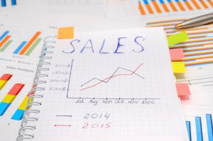 text sales at notebook with analytic graphs and charts, pen, dollar