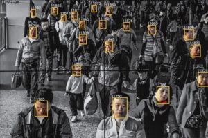 Monitors display a video showing facial recognition software in use at the headquarters of the artificial intelligence company Megvii, in Beijing.